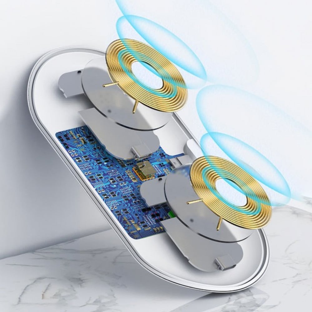 - يدعم شحن جهازين لاسلكيًا في وقت واحد، مثل الهواتف الذكية وسماعات الأذن اللاسلكية.